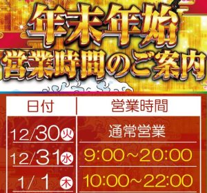 - 年末年始営業のご案内平素より東横グループの遊技場をご愛顧いただき、誠にありがとうございます。 東横フェスタ4店舗の年末年始の営業時間変更について、ご案内申し上げます。 ・12月30日午前9時~午後10時45分 通常営業 ・12月31日午前 […]