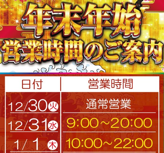 2025年12月29日 / 最終更新日時 : 2025年12月29日 Manager アミューズメント 年末年始営業のご案内 平素より東横グループの遊技場をご愛顧いただき、誠にありがとうございます。 東横フェスタ4店舗の年末年始の営業時間変更について、ご案内申し上げます。 ・12月30日午前9時~午後10時45分 通常営業 ・12月31日午前9時~午後8時 時短営業 ・1月1日午前10時~午後10時 時短営業 ・1月2日~午前9時~午後10時45分 通常営業 皆様のご来店心よりお待ちしております。